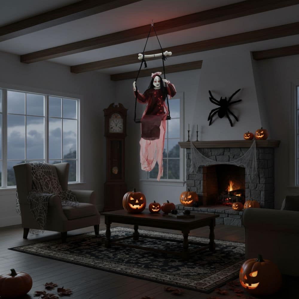 Vous la verrez, balançant lentement, une présence éthérée qui invite à la rêverie. N’est-ce pas la touche parfaite pour ceux qui cherchent à infuser leur Halloween d’une élégance spectrale, où chaque regard posé sur elle éveille une histoire oubliée et une interrogation sur le passé ?
