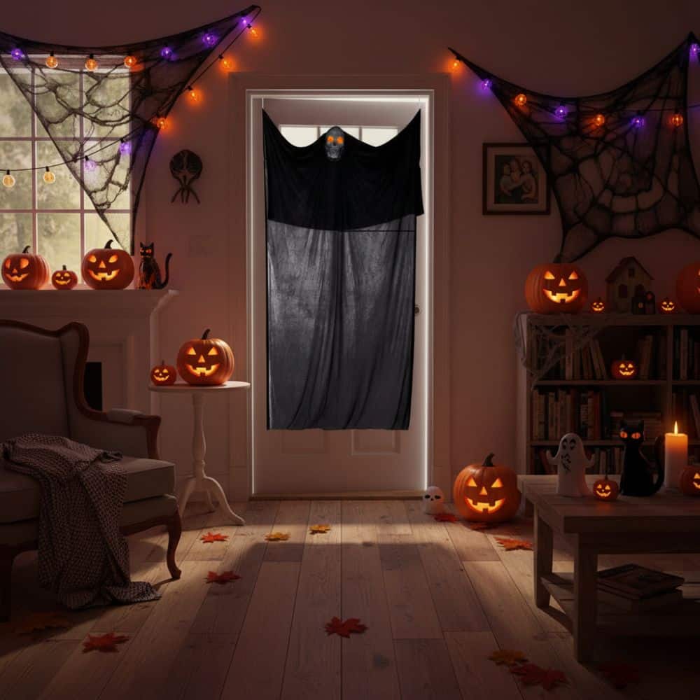 Ce rideau de porte fantôme pour Halloween est conçu pour jouer avec l’imagination, pour suggérer une présence sans jamais la révéler entièrement. Ses tissus légers, presque impalpables, semblent onduler d’une vie propre, comme si un esprit invisible les traversait constamment.
