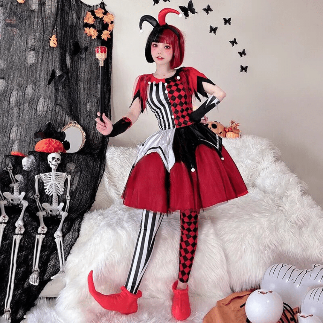 Les manches courtes bouffantes se parent de tulle noir et rouge, ajoutant une touche de fantaisie à l’ensemble. Un volant à pompons noir et blanc ornant partiellement la jupe apporte une note ludique, rappelant les racines festives du personnage d’arlequin.