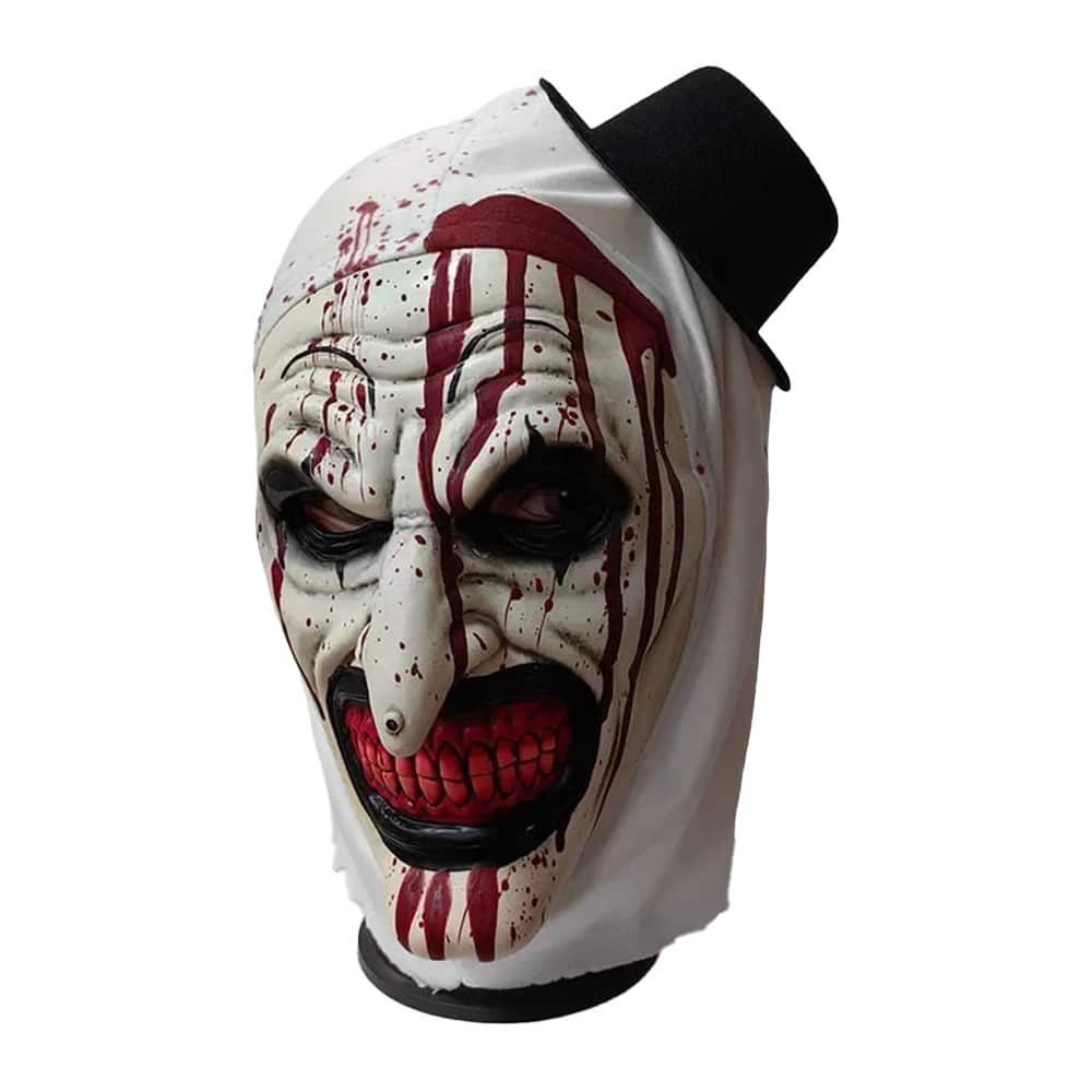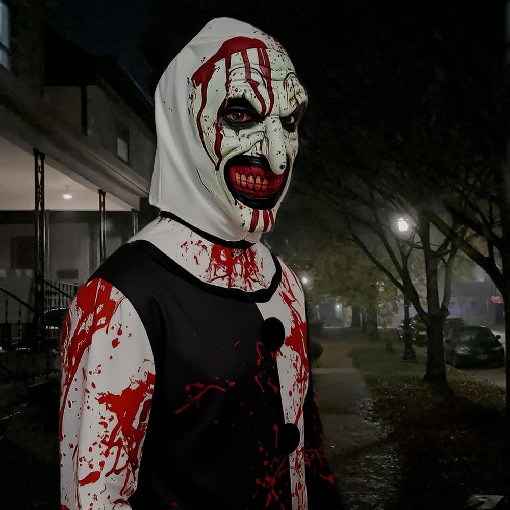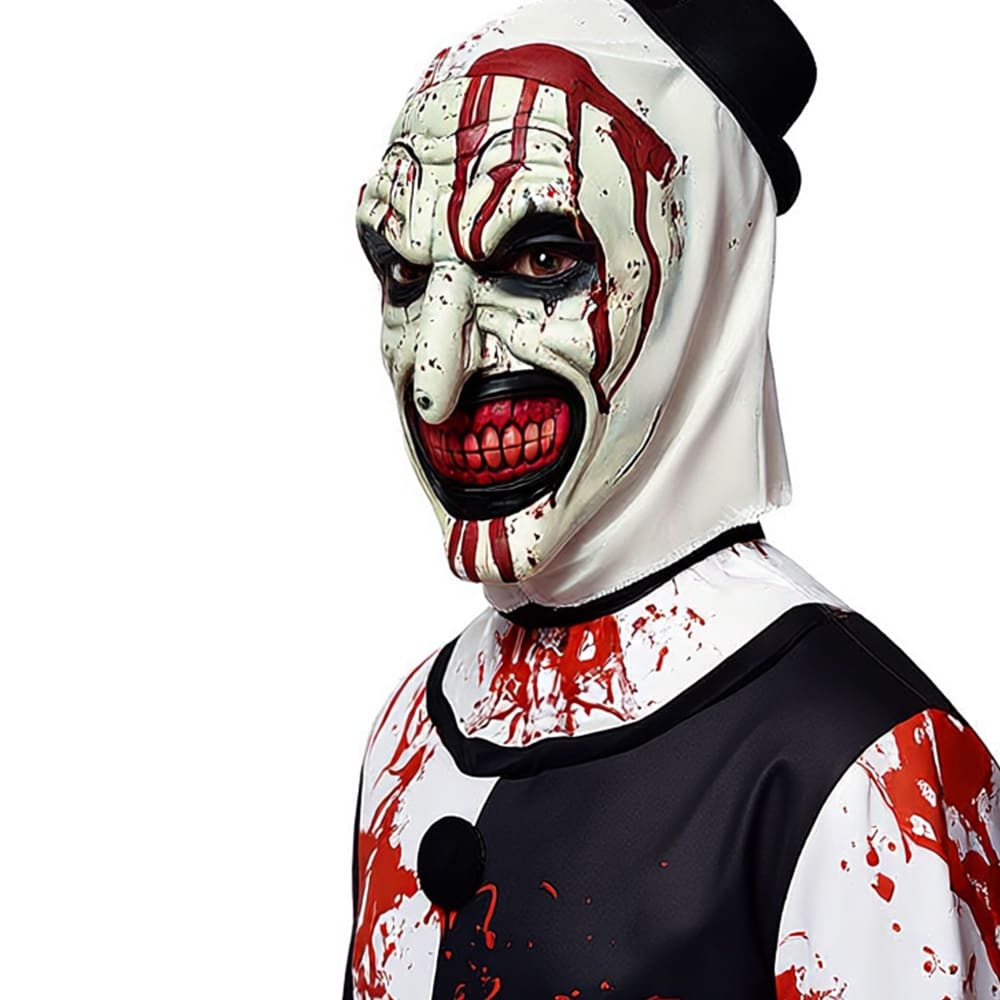 Transformez-vous en Art le Clown, ce personnage qui redéfinit les codes de l’horreur contemporaine. Cet ensemble noir et blanc aux projections sanglantes reproduit fidèlement l’apparence du protagoniste de Terrifier.