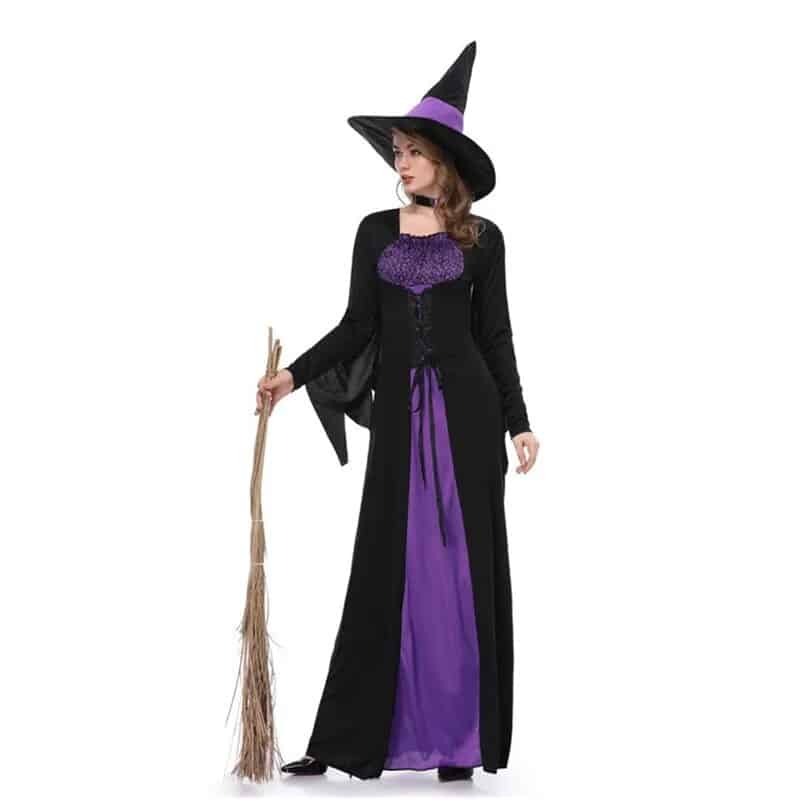 Ce déguisement de sorcière violet et noir est l’incarnation parfaite de l’élégance mystérieuse. Cette tenue captivante est idéale pour celles qui veulent se démarquer lors d’une soirée costumée ou d’Halloween. La robe longue, principale pièce du costume, est d’un violet profond qui attire immédiatement le regard.