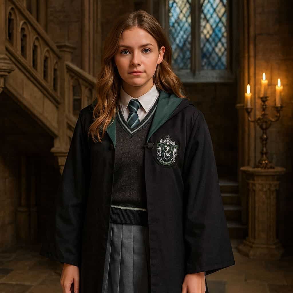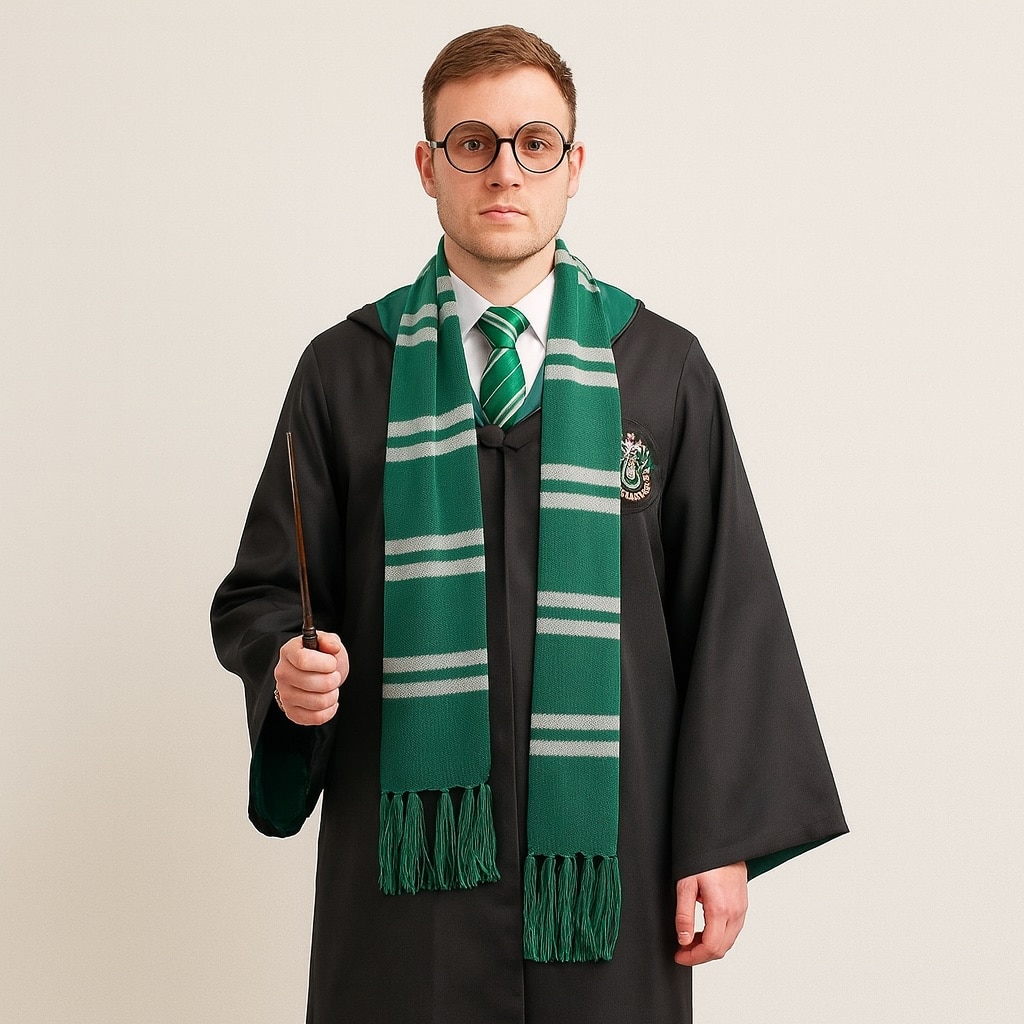 La maison Serpentard se reconnait par ses couleurs, le vert et l’argent ainsi que par le serpent d’argent. Cette maison accueille les sorciers malins et roublards qui parviennent toujours à leurs fins. C’est aussi Serpentard chez qui il y a le plus d’adeptes de magie noire. C’est d’ailleurs celle où résidait Voldemort.