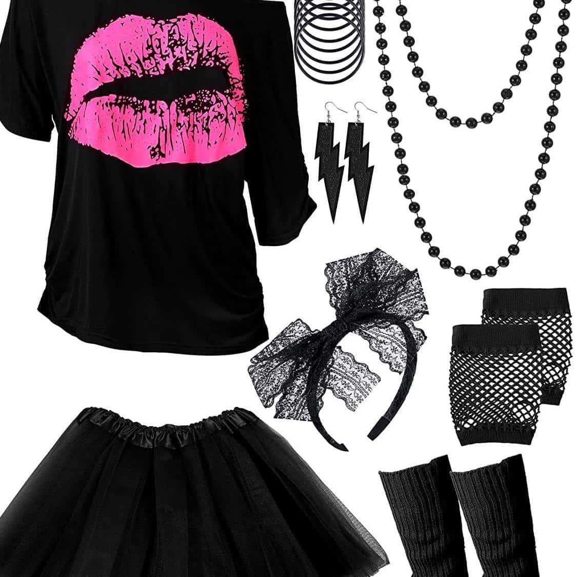 Les années 80 étaient connues pour leurs couleurs vives notamment. Ce costume est composé d’un t-shirt noir oversize avec un logo sur le devant représentant une bouche, pour aller avec une superbe jupe courte fluo en tulle. Pour un look audacieux et terriblement 80’s !