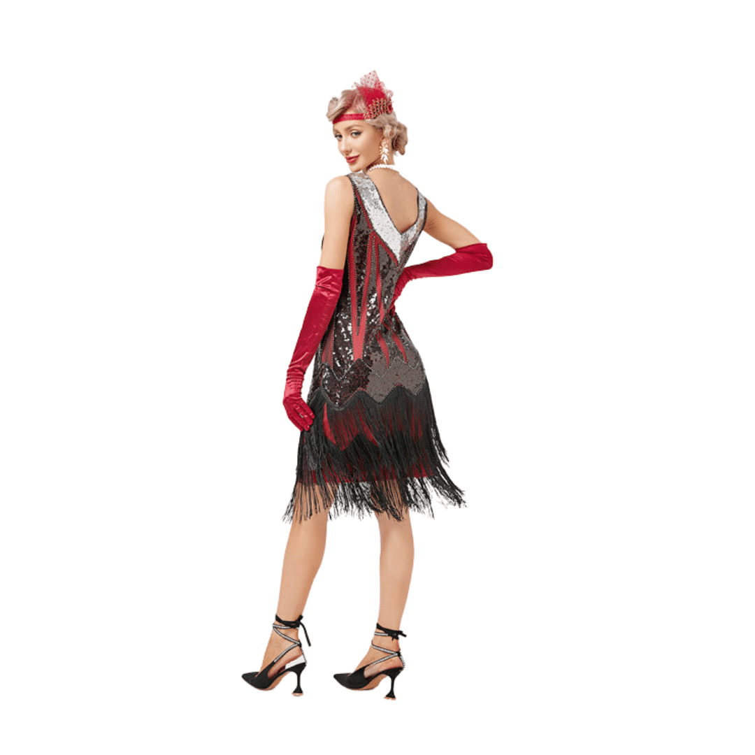 Ce costume vintage se compose d’une robe rouge à sequins brodés au col V plongeant et avec des franges comme le veut la tradition. Plongez dans l’ère glamour des années 1920 avec ce magnifique costume vintage de Charleston.