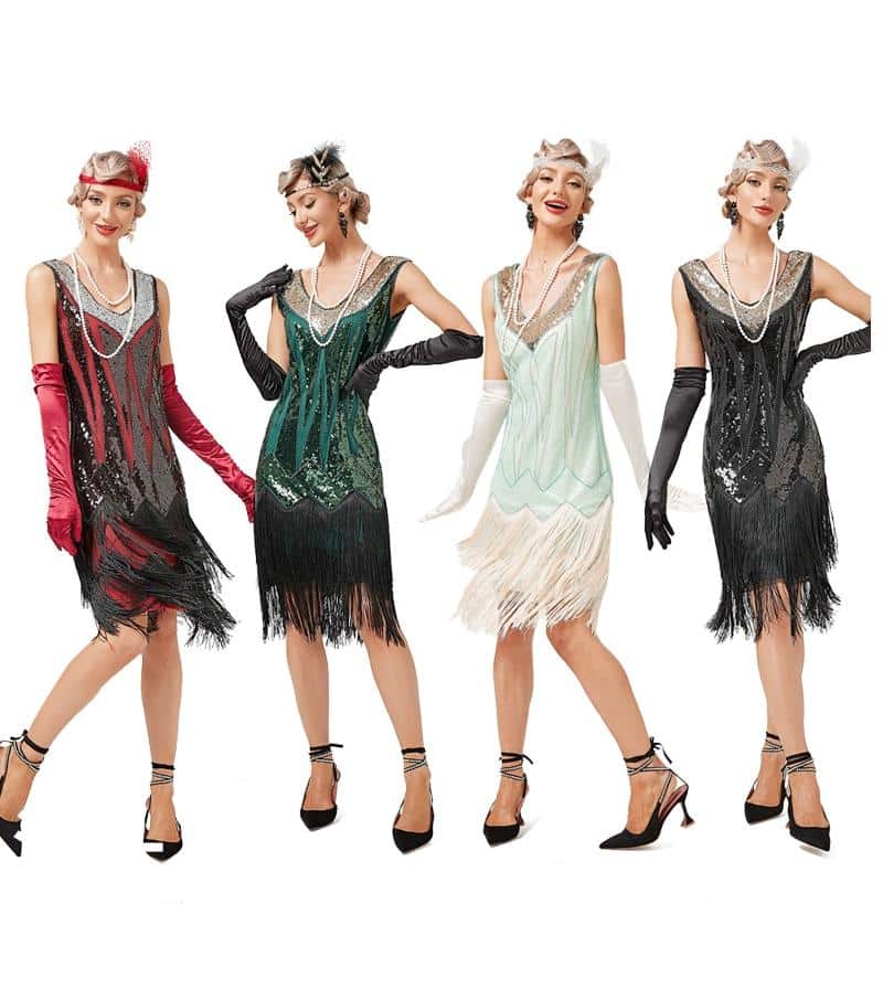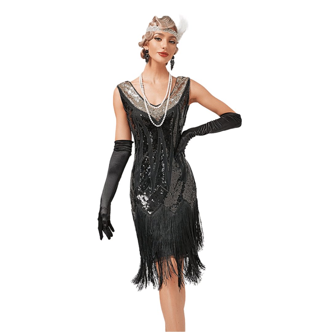 Cette robe polyvalente peut être associée à différents accessoires pour créer des looks uniques. Pour un look authentique des années 1920, portez-la avec un boa majestueux à plumes et des gants longs.