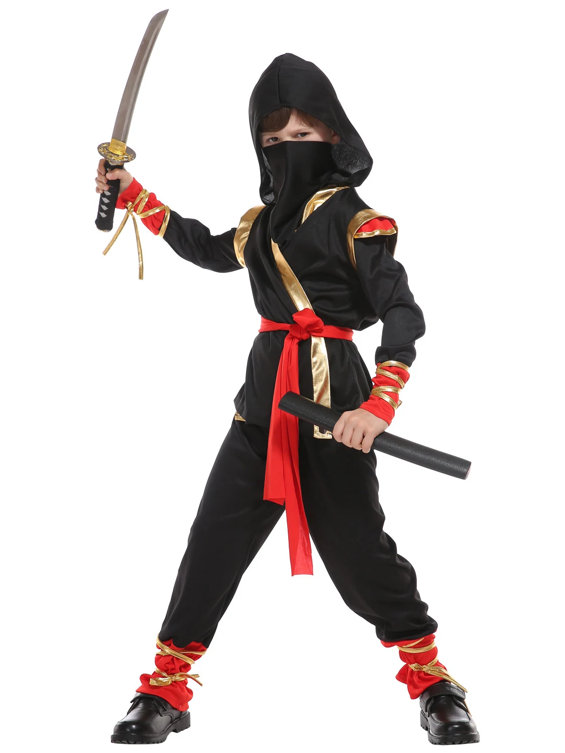 La panoplie de Ninja comprend une tunique noire et dorée ainsi qu’un pantalon et est accompagnée d’accessoires pour compléter le look. Une ceinture rouge à nouer, ajoute une finition authentique et permet d’ajuster le costume à la taille de l’enfant. Pour parfaire la tenue, le costume est accompagné d’un pantalon plutôt ample, offrant une liberté de mouvement optimale.