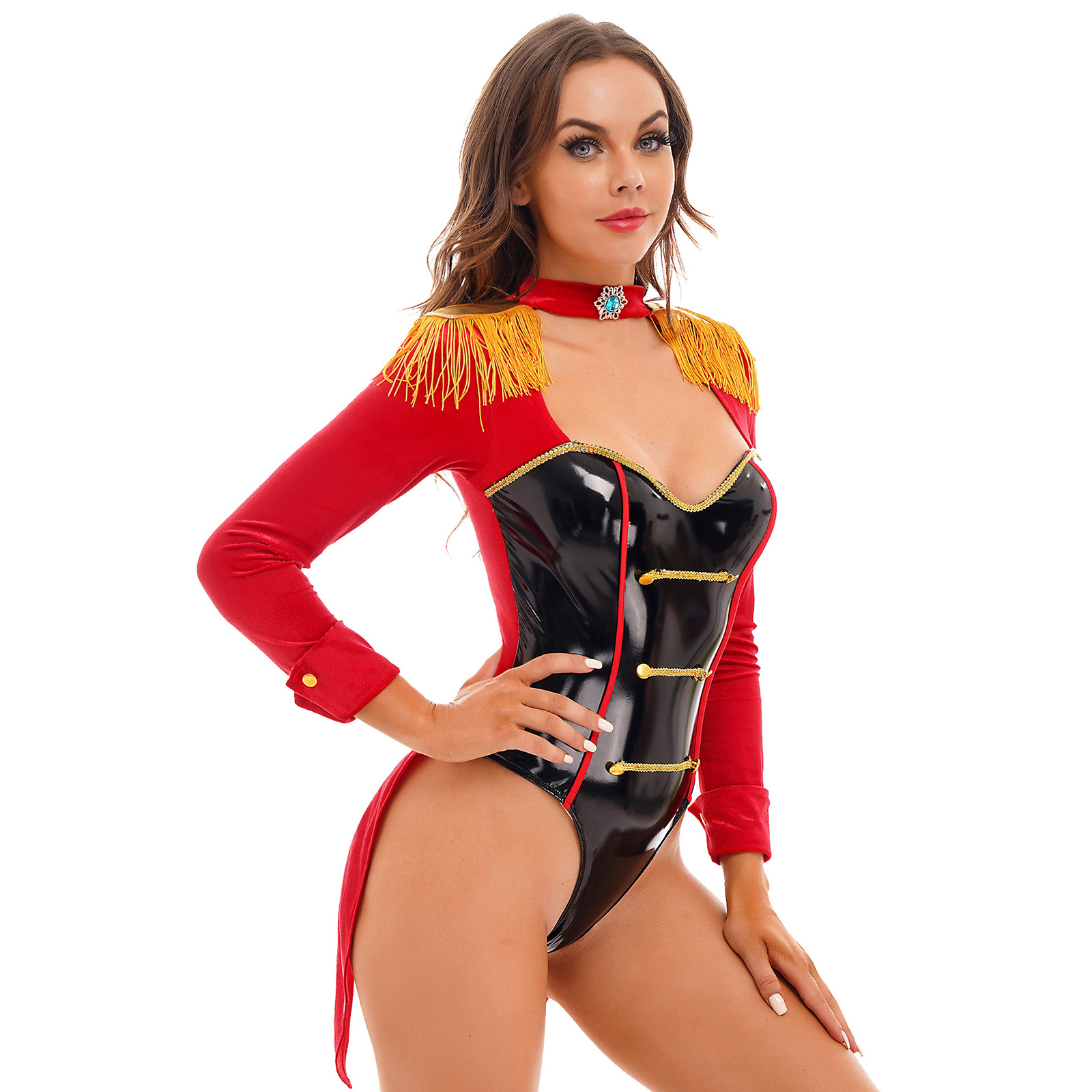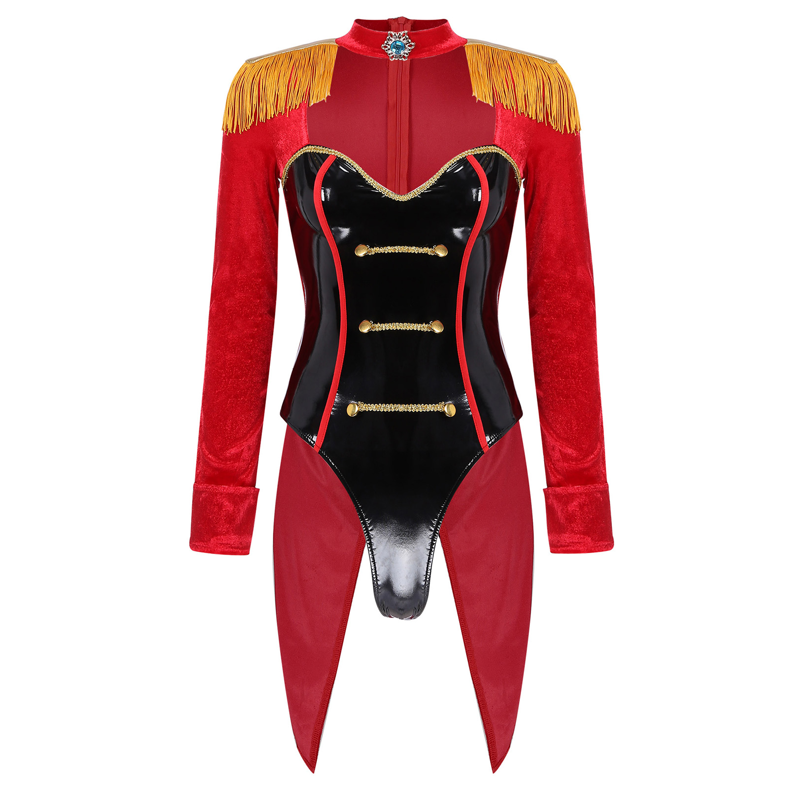 Ce costume se compose d’un body noir en vinyle échancré avec des détails dorés sur le devant, imitant la tenue d’un compteur classique. La veste rouge ou bleue venant compléter cette pièce ajoute une touche d’authenticité à l’ensemble.